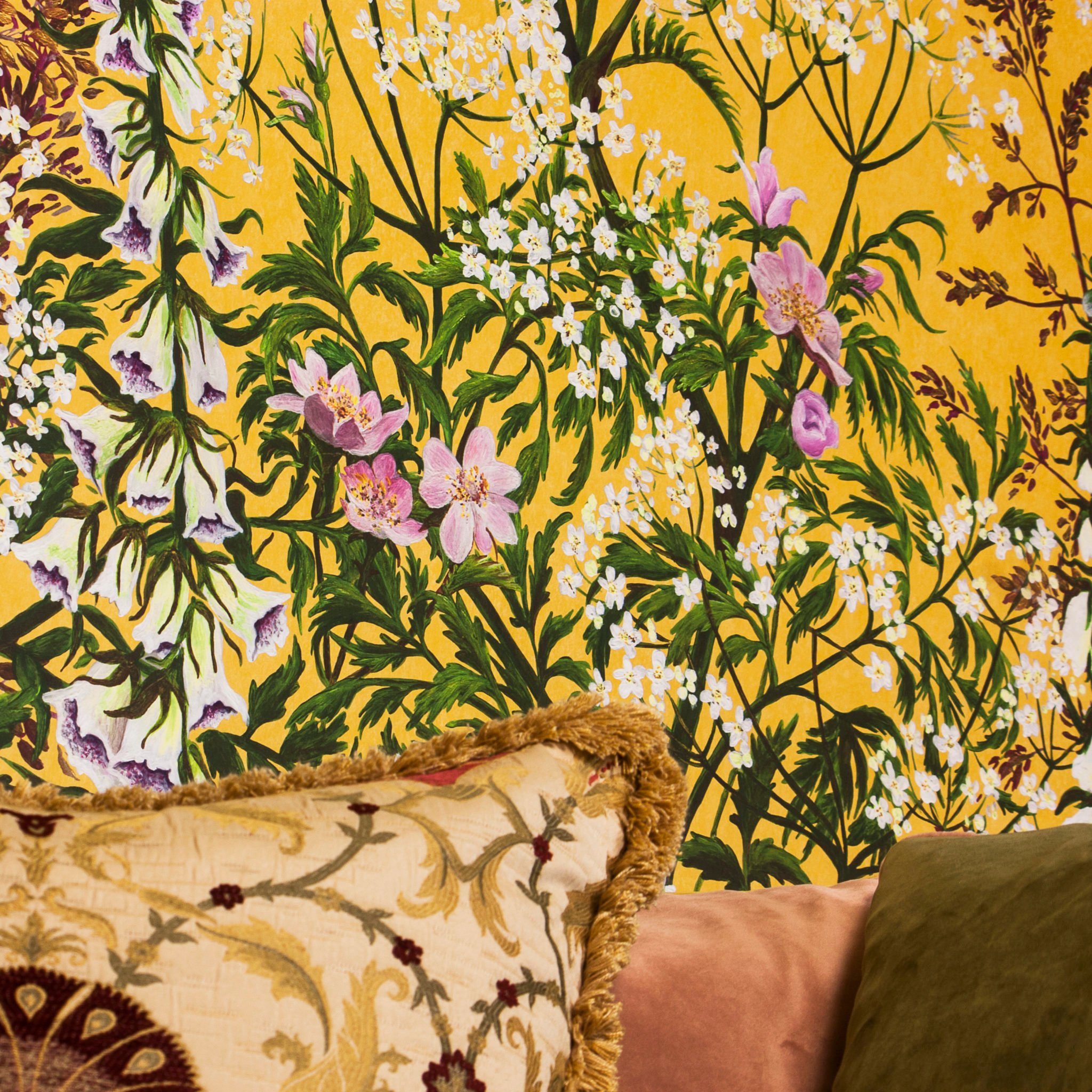 At Edward Bulmer Natural Paint we love to support and collaborate with small brands who, like us, have a deep respect and passion for nature and our planet. Beautiful by George create 100% plastic-free mural wallcoverings which are both eco-friendly and beautiful: the sustainable ‘Spring Tonic’ collection embodies our philosophy of having the lightest touch on the earth possible. 'High Noon' in our London Showroom Beautiful by George’s hand-painted wallcoverings are made on eco non-woven paper with non-toxic inks and designed to radiate glimmers of nature with its luscious greens and vibrant wildflowers. The papers contain no PET plastic fibres – like many wallpapers or wallcoverings. It is FSC certified and made from 99% renewable raw materials (Renewable cellulose (wood pulp) fibres, Renewable Binder, Renewable PLA fibres (a plant derived thermoplastic). They also use approximately 30% less Greenhouse Gases in manufacturing PLA fibres compared to PET fibres. To find out more read George’s full eco credentials on the website and start shopping! www.beautifulbygeorge.com To fully appreciate these exquisite designs do come to our new showroom where you can see the stunning ‘High Noon’ mural against our ‘Ochre’ and leading on to ‘Invisible Green’. The ‘Spring Tonic’ collection can be combined with our pioneering plant-based paints aided by the palette of colours that we have created to complement them. See our recommended colour matches below. Our Edward Bulmer customers can receive an exclusive 15% discount at Beautiful by George for each mural purchased. Sign up here! The only problem you will have will be choosing which beautiful colourway! It is definitely a case of bringing the outside in with these beautiful designs; the main body of the design is luscious greens, cool whites with hints of pink in the Foxglove and Dog Rose flower centres, the Yorkshire Fog Grass and stems of Cow Parsley. Inspired by early morning Summertime walks with George’s dog, Fudge. where all the wildflowers and hedgerows look so bright and fresh. This mural panel set is ideal as a special back drop in a main room or a long singular wall like along a landing. It will feel fresh and vibrant all year round and mostly it will lift your mood and make you feel happy! ‘High Noon’ is such a warm and jolly colour that is complemented by both calm neutrals and vibrant colours: Turquoise Order a Sample Stone White Order a Sample Invisible Green Order a Sample Fine White Order a Sample Pea Green Order a Sample ‘Twilight’ ‘Twilight’ is full of earthy and natural colours so using complementary tones, related colours or warm contrasts on the colour wheel enhances the tranquility: Portland Order a Sample Brick Order a Sample Spanish White Order a Sample Invisible Green Order a Sample Clove Order a Sample 100 60 40 20 ‘Morning Mist’ For ‘Morning Mist’ we recommend using underlying colours of red and violet – whilst it sounds like a strong colour suggestion, it pairs so well as the colours are actually related: Fawn Order a Sample 100 60 40 20 Pompadour Order a Sample Wash Stop Order a Sample Invisible Green Order a Sample Lilac Pink Order a Sample 100 60 40 20 ‘Rosy Dawn’ The perfect pink! ‘Rosy Dawn’ makes for a lovely warm and light bedroom and looks perfect with our neutral paint colours: Eau de Nile Order a Sample 100 60 40 20 Rose Tinted White Order a Sample Invisible Green Order a Sample Duck Egg Order a Sample Pearl Colour Order a Sample ‘Midnight’ The deep, luxurious colours of ‘Midnight’ pairs with split complimentary colours and related colours to create a statement: Pippin Order a Sample Nicaragua Order a Sample Invisible Green Order a Sample Trumpington Order a Sample Pure White Order a Sample Don’t forget to sign up to our newsletter to receive this amazing 15% off discount. Simply sign up here.