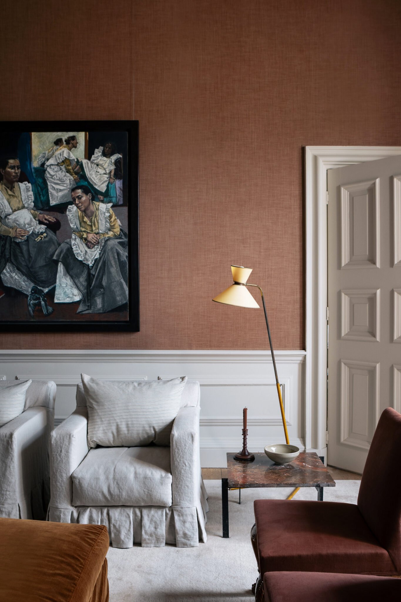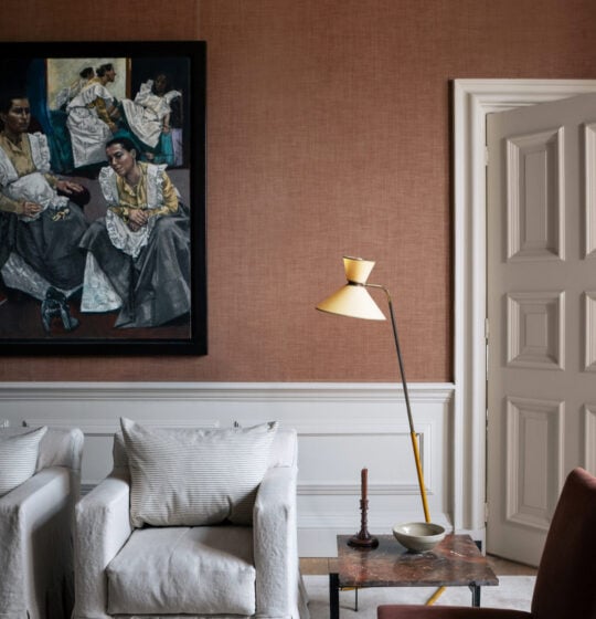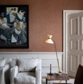 Lucian Freud was one of the greatest portraitists of his generation, his work searing in its scrutiny and almost anatomical in its rendering of flesh. To hang his paintings at Chatsworth, Laura Burlington chose a plain weave that absorbs the ochres, blacks, blues and whites in his palette, giving a colour that hovers between beige and decayed rose petal: affirming but not too assertive.
